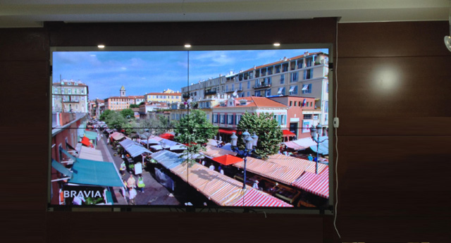 该政府单位安装的拼接墙是用于宣传片的播放,故选用拼缝为3.5mm的液晶拼接屏,其安装的拼接墙的拼缝无线接近“无缝拼接”。针对其安装方式,前期客户与我公司的销售人员简述安装要求,我公司设计师按照客户要求设计效果图,工程人员在安装过程中,结合效果图与客户要求,采用液压支架式安装。