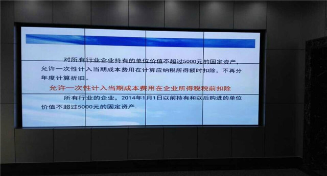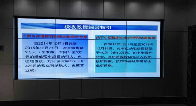 成都市成华区国家税务局为了政策指导、便民指引的需要,采用了我公司的第四代46寸DID窄边液晶拼接屏,以3x4的结构构成整个拼接墙。该产品的分辨率为1920x1080,拼接缝隙为5.3mm,采用LED背光,通过智能无线控制与双DVI接口实现画面切换更加方便,节能环保。测试之后,客户体验使用效果并签收。在使用过一段时间后,客户更是发来反馈,对我们的产品表示非常满意,满足了他们对展现国税政策、便民利民的基本需求。