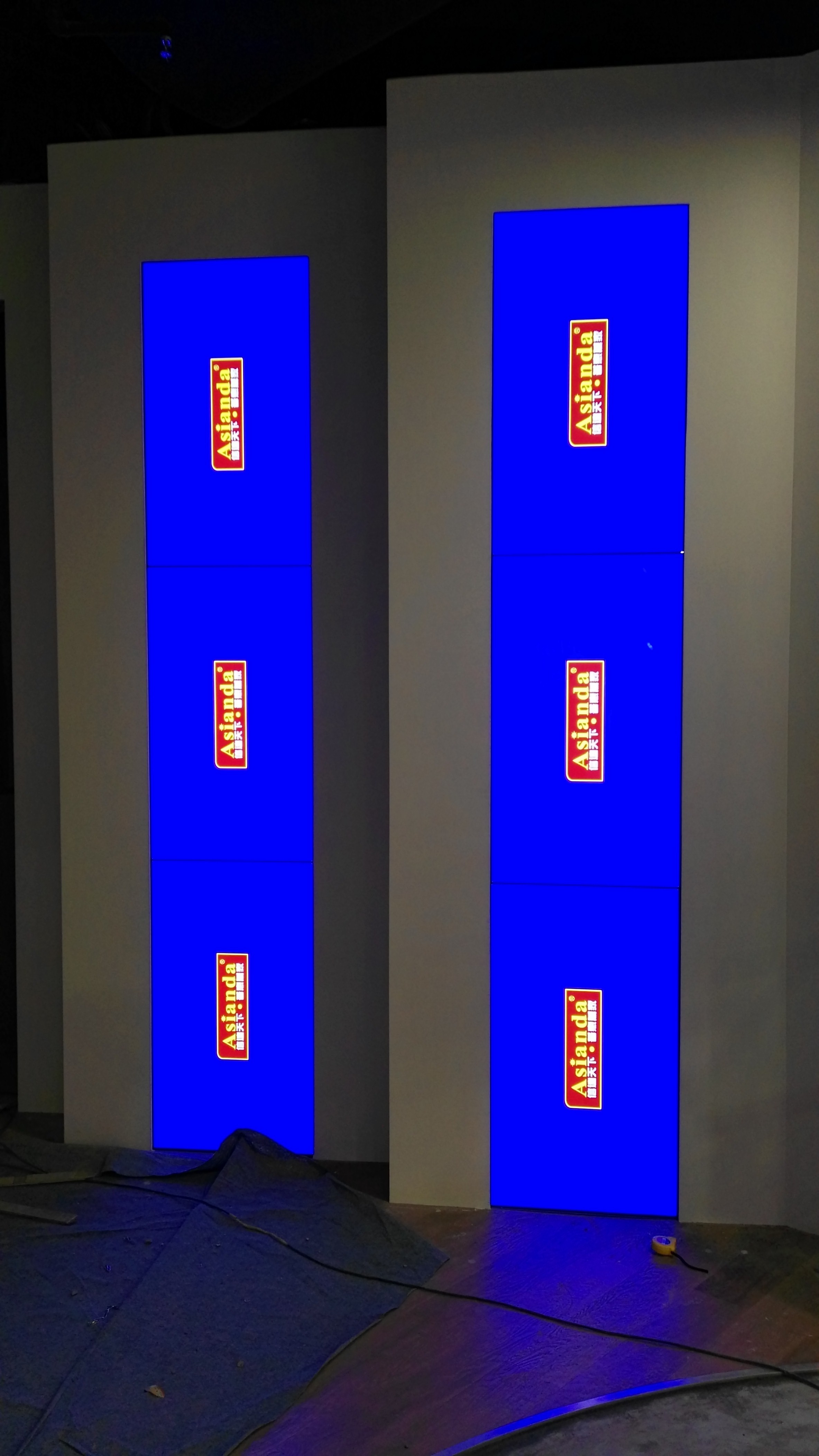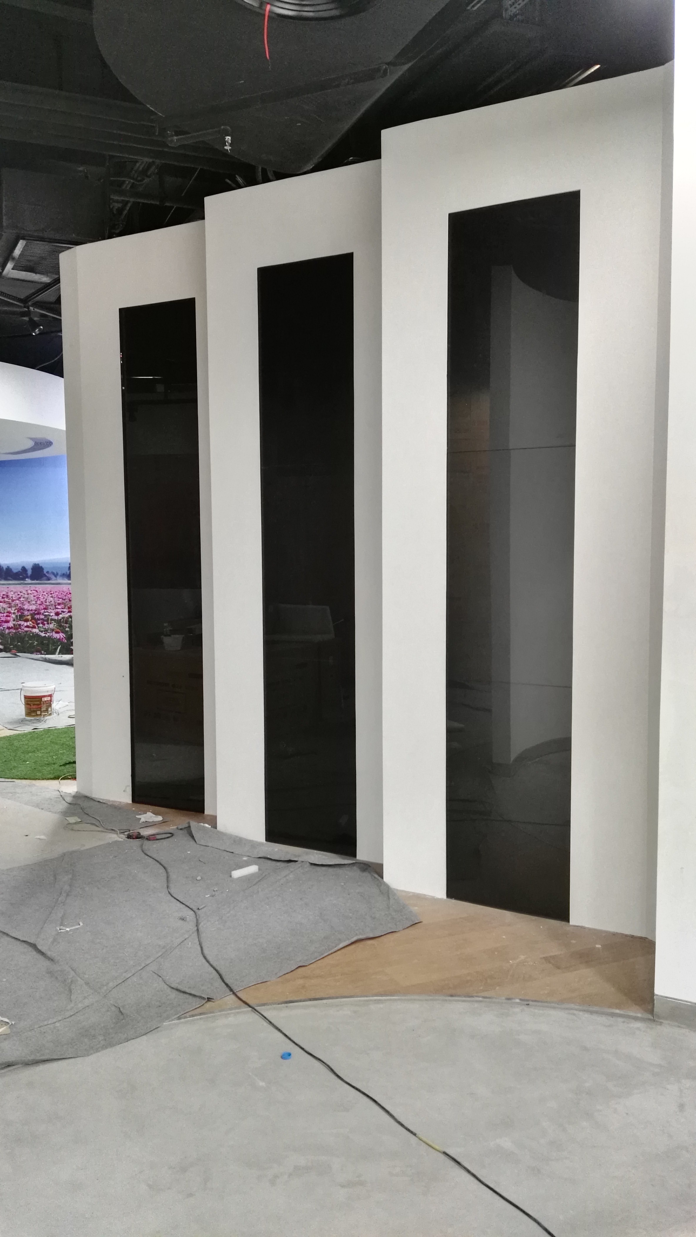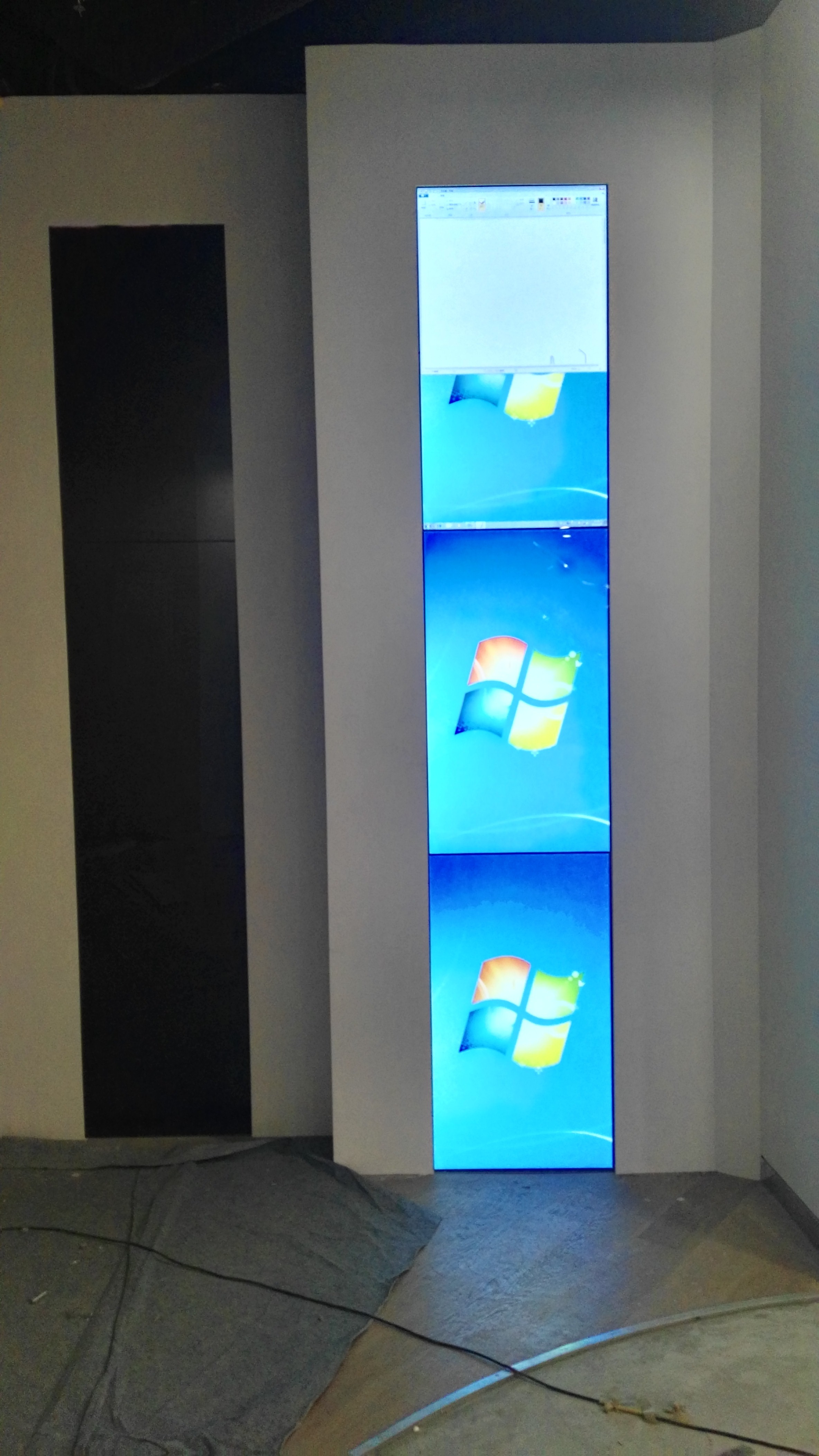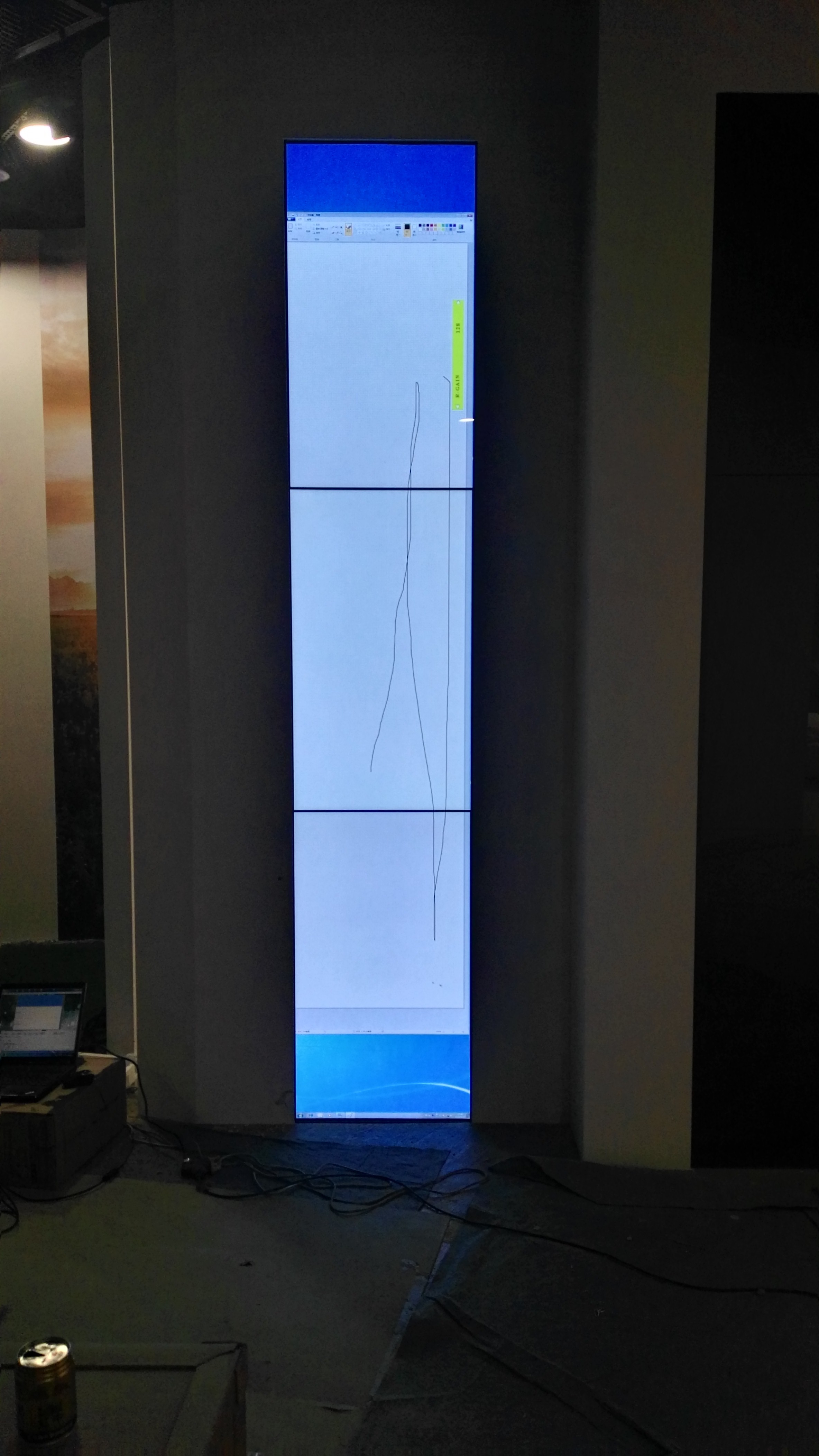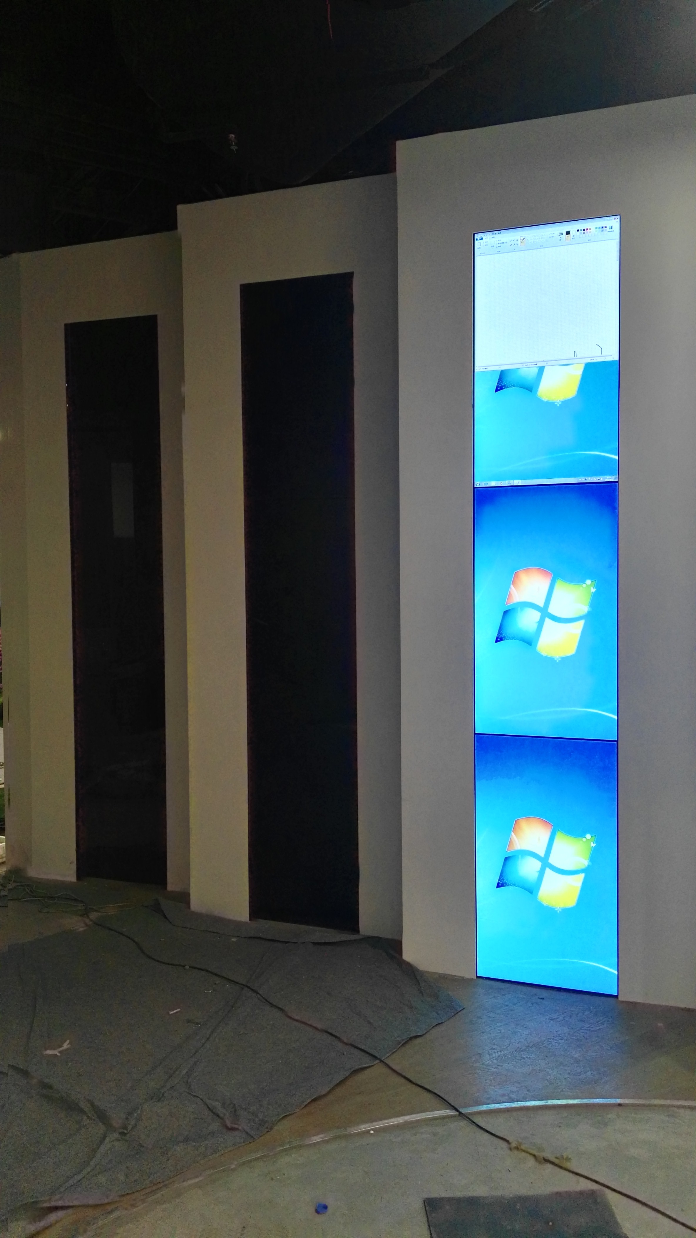北京某公司体验馆显示系统_46寸液晶拼接屏采用了雅迅达3×1×3的拼接的46寸液晶拼接屏,项目分成3组共9块拼接屏,并搭配了多屏处理器高清显示设备。矩阵使用网络控制,大屏也是网络控制,可以实现多画面同时显示,并且可以实现自由开窗,监视窗的窗口大小可以自由调控、位置可以随时挪动,可以随时切换信号源。是一种非常灵活的显示方案,对于多监控、多功能的公司显示系统,这个使用非常合理。同时项目采用竖屏安装,其中两套安装了防炫目玻璃,一套安装了红外触摸。
