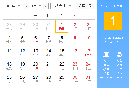 自2016年1月1日(星期五,国家法定节假日)至1月3日(星期日)放假,共3天。2016年1月4日(星期一)正常上班。节日服务热线:189 0284 0932