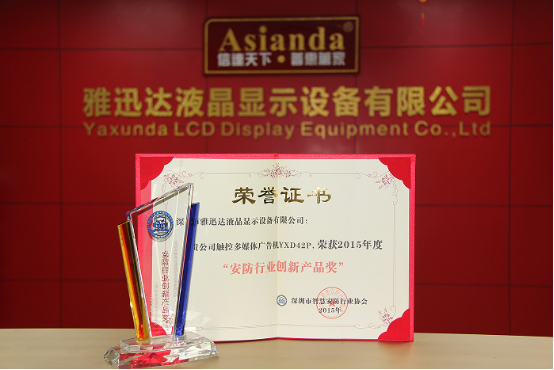由智安协主办的2015年度安防行业奖项评选颁奖典礼在政府单位、中国安防企业家俱乐部、地产物业、工程商、设计院、智安协专家、国内众多知名安防企业代表和媒体的见证下也颇为隆重。雅迅达参与评选的“触控多媒体广告机YXD42P”获得了政府、协会的认可和高数据的网络用户投票,并荣幸夺得“安防创新产品奖”。