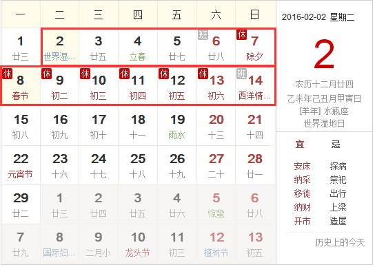 自2016年2月2日(周二)至2月14日(周日,正月初七)放假,共13天。2016年2月15日(周一,正月初八)正常上班。节日服务热线:189 0284 0932