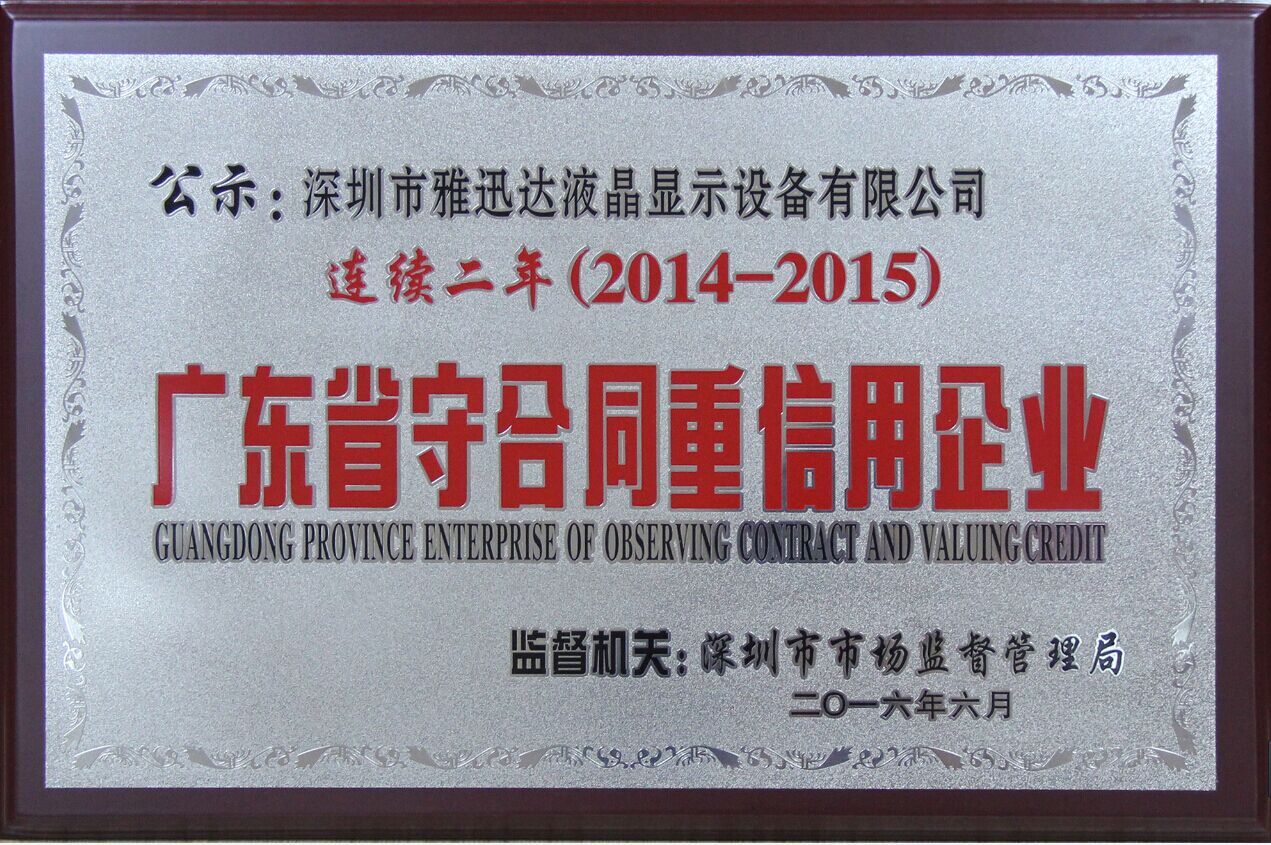 近日,2015年度广东省守合同重信用企业授牌仪式圆满举行。经过广东省网商协会的公示推荐,深圳市雅迅达液晶显示设备有限公司顺利通过广东省工商局的最终评审,获得“广东省守合同重信用企业”荣誉称号! 这也是雅迅达二度荣膺“广东省守合同重信用企业称号”。