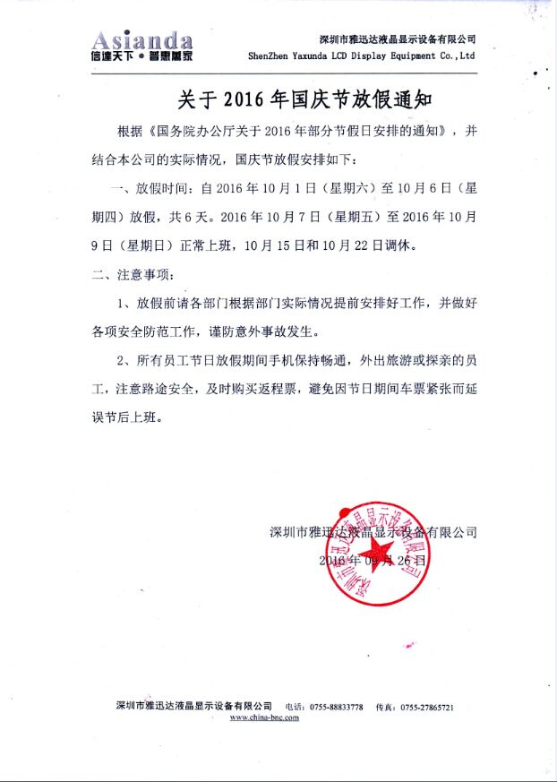 深圳市雅迅达液晶显示设备有限公司2016年国庆节放假通知