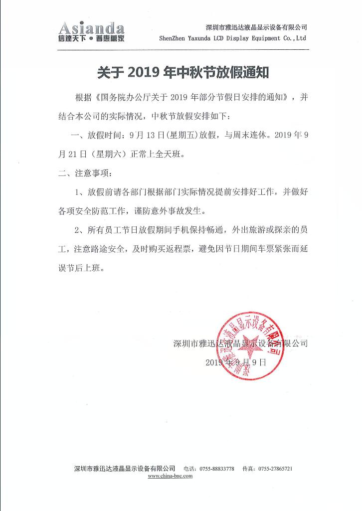 根据《国务院办公厅关于2019年部分节假日安排的通知》,并结合本公司的实际情况,中秋节放假安排如下: