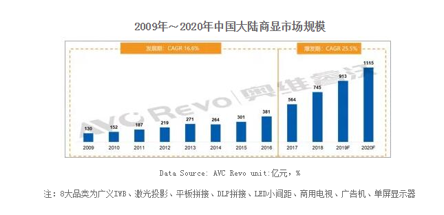 根据奥维睿沃数据统计,2018年,中国大陆商业显示规模达到745亿元,同比增长32.2%,未来5G等技术的商业化、新零售市场的爆发及政府对新型基础设施投资力度,奥维睿沃预计未来3年商显市场仍将保持25.5%的增长速度,2020年市场规模将超千亿元。