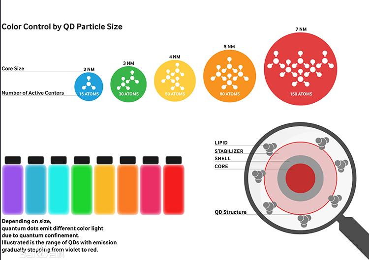 量子点又可称为纳米晶Quantum dots(QD),粒径一般介于2~10几nm之间,发光原理是通过电或光对量子点材料施加刺激,量子点的材料将发射特定频率的光,并且这些频率可以通过改变量子点的尺寸大小和形状进行改变,从而达到精确地调谐。