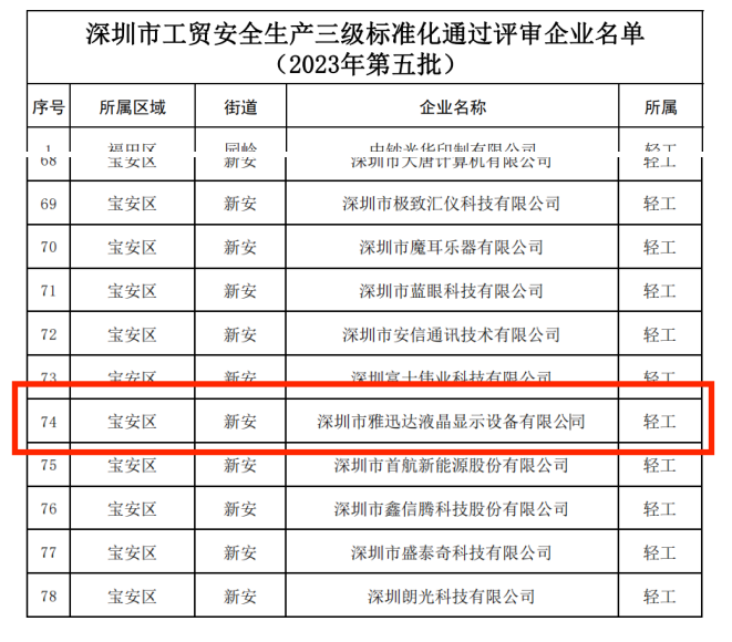 近日,雅迅达公司顺利通过了深圳市工贸安全生产三级标准化评审,成为行业内让我们为获得此项殊荣的企业。这一喜讯的传来,之欢欣鼓舞,同时也为公司的安全生产水平再次提升了一个台阶。