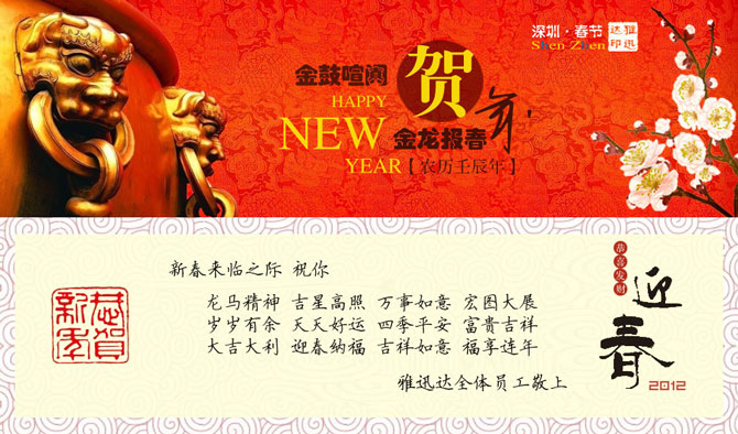 又是一年新来到!惜别2011,又迎来了充满希望、机遇和挑战的2012年!在此,感谢大家在过去一年里对雅迅达的支持与信任的同时,也希望在新的一年里,雅迅达能荣幸继续得到大家的关注及支持,并且雅迅达也会一如既往地为大家提供更优质的服务!