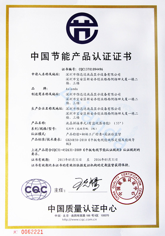 雅迅达55寸液晶拼接单元节能产品认证证书见图: