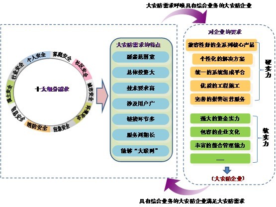 前文已述,大安防包括个人安全、城市安全、消防安全等十大类细分需求,仔细分析这些需求,可以概括出大安防的需求层面具有覆盖范围宽、总体投资大、技术要求高、涉及用户广、链接环节多、能够“大联网”等特点,为了满足这些需求,大安防的供给层面,也就是安防企业,必须具有全系列产品线的生产制造能力、大系统平台的设计开发能力、大工程项目的施工安装和维保能力以及综合安防业务的运营服务能力(这些能力属于企业的“硬实力”范畴)。而就目前国内安防行业的现状来看,国内绝大多数安防企业都没能同时具备这些能力,因此必须借助并购等手段来快速构建大安防企业,这就要求有志于成为“大安防企业”的企业必须同时具备雄厚的资金实力和资本运作经验、富有弹性的包容文化、丰富的企业整合与管理能力等,这些则是企业的“软实力”。