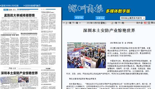 在大众媒体的报道中,许多媒体对安博会的规模表示惊叹,同时对我公司新产品印象深刻。深圳商报在《深圳本土安防产业惊艳世界》的专题中报道称:“2013第14届CPSE安博会日前在深圳落下帷幕,本届展会总面积达12万平方米,全球超过150个国家和地区的安防人士参会,专业观众人数超过12万,展览规模和观众人数均实现了历史性新突破。深圳本土品牌的强势亮相更把展会推向高潮。”