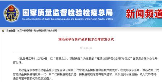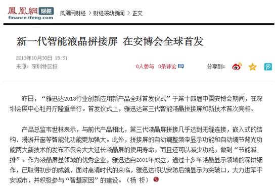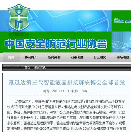 《深圳商报》此文中还重点报道了,在本届安博会上,“雅迅达2013行业创新应用新产品全球首发仪式”在深圳会展中心举行。据悉,雅迅达第三代智能液晶拼接屏采用三星液晶面板,配置顶级的S-PVA技术,以及高静态对比度功能,其高透光率可让产品节能10%以上,全视角3D效果和超窄边无不显示其深厚的资源整合能力、精湛的工艺和超强的软件优化。并重点发布了两项新技术:拼接屏的自动调整频率显示功能和自动调节背光功能。“雅迅达产品已广泛应用于国防安全、公检法系统信息化、医疗卫生、教育系统、智能交通系统、轨道交通系统、视频会议系统、广告传媒系统等众多领域。”