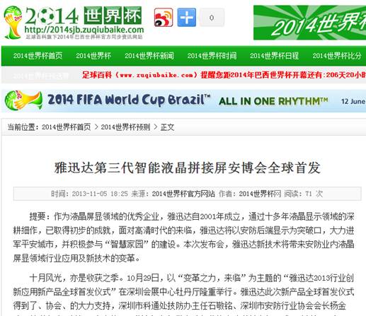 另外,“2014世界杯官方网站”也对我公司液晶拼接屏进行了重点报道。据悉,我公司液晶拼接产品将应用于2014年巴西世界杯上,国外市场上,我公司的产品和解决方案已经延伸到欧洲、大洋洲和南美洲。2014年,世界人民将看到我们雅迅达产品,我公司正在为世界安全贡献着自己的力量。