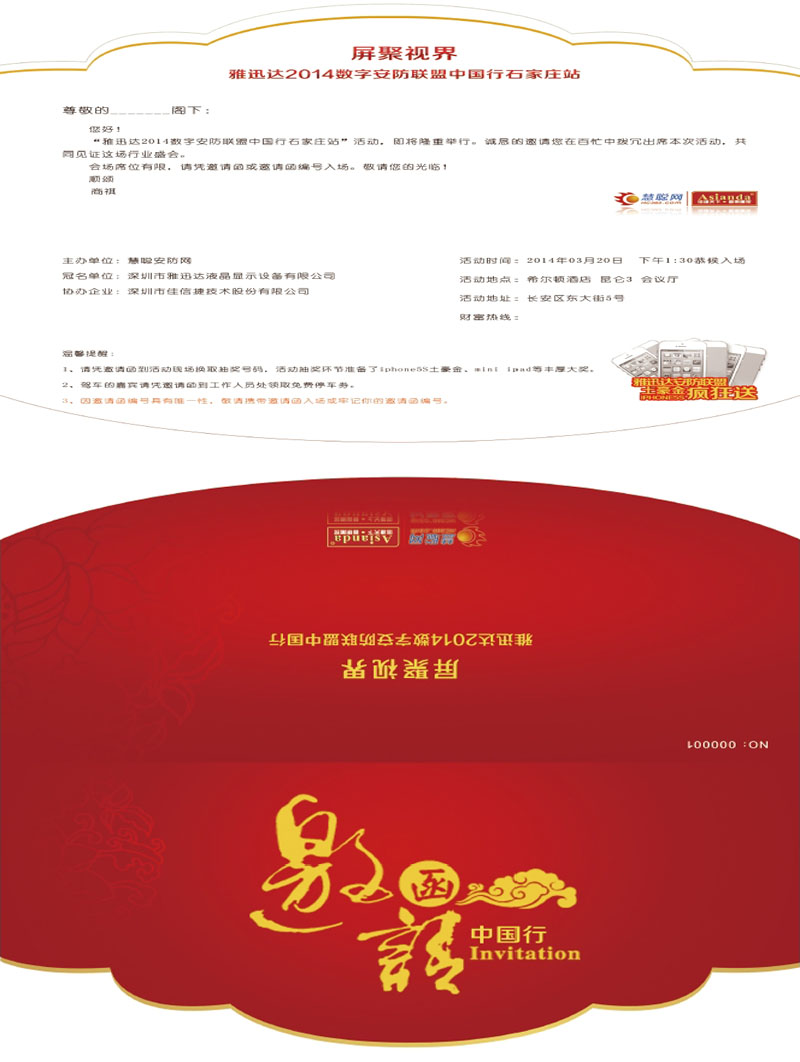 “安防中国行”活动作为雅迅达2014年最重要的活动之一,对于活动的每个细节都追求尽善尽美,细致入微。雅迅达对每一位参与活动的客户都十分看重,因此为也参加活动的客户打造了唯一编码的专属邀请函。