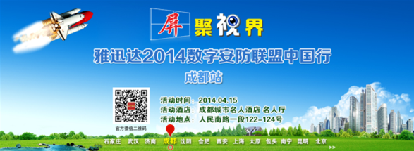 “屏聚视界——雅迅达2014数字安防联盟中国行”成都站活动将于明日(4月15日)在成都城市名人酒店拉开序幕。本次活动由深圳市雅迅达液晶显示设备有限公司独家冠名,慧聪安防网承办,深圳市佳信捷技术股份有限公司、广东铂亚信息技术股份有限公司、珠海市太川电子企业有限公司联合协办。四川省公安厅科技信息化办公司副主任葛城先生、中国科学院成都计算机应用研究所总工程师研究员张炳泉教授等领导、专家将出席本次活动。