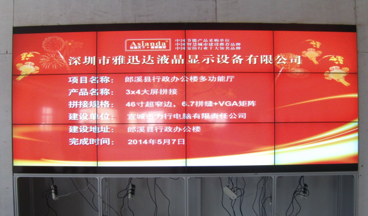 郎溪县行政会议系统是由雅迅达3*4共12块46寸大屏组成,产品型号为PJ-B461P-6D。因为高分辨率、超高对比度、画质细腻亮艳的特性,雅迅达PJ-B461P-6D被广泛应用于安防、会议、警备、商业、金融、煤矿等各领域。