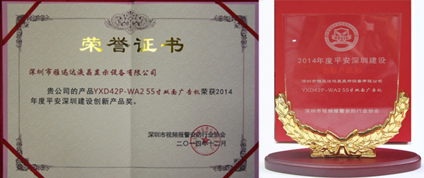 议程中,大会对“2014年标准化十佳安防企业奖”、“2014年年度平安深圳创新产品奖”、“2014年年度平安深圳优秀项目奖”、“2014年平安深圳建设杰出贡献奖”等多个奖项进行了年度表彰。我公司YXD42P-WA2 55寸双面广告机在整个评选过程中,以优异的性能及创新性征服了专家评委,获得“2014年年度平安深圳创新产品奖”。