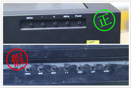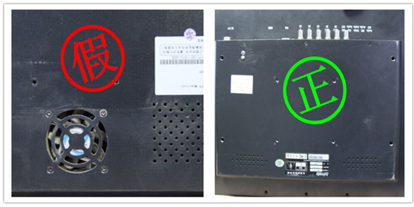 雅迅达正规液晶监视器的LOGO粘贴工整精致。如发现LOGO做工粗糙,有明显粘贴痕迹,或喷刷情况,均为假冒产品,如图1左侧