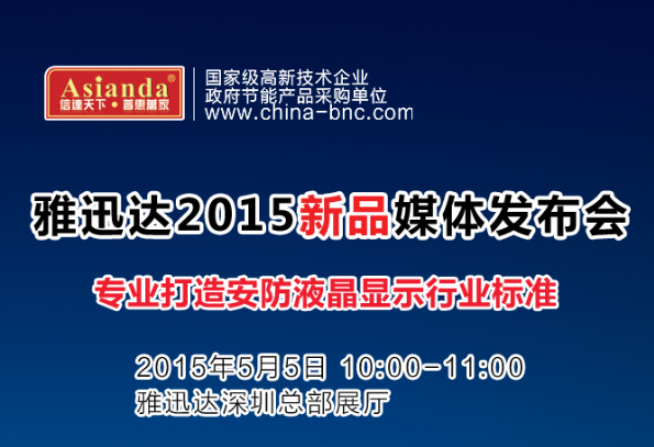 我公司研发的产品如第三代、第四代智能液晶拼接屏、高清液晶监视器等系列新产品经过市场发酵期之后,已经得到了各行业面的一致认可。5月5日,雅迅达2015年首场新品媒体发布会将隆重举行,在公司总部深圳召开“2015年新品发布会暨媒体见面会”。