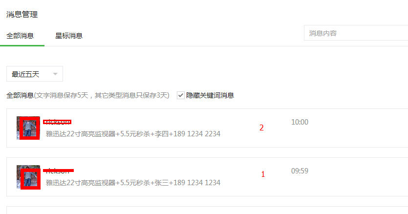 从秒杀时间开始(10点50分),成功发送活动规定文字到后台“消息管理”的前十名参与人员,确认为本次秒杀活动的幸运儿。