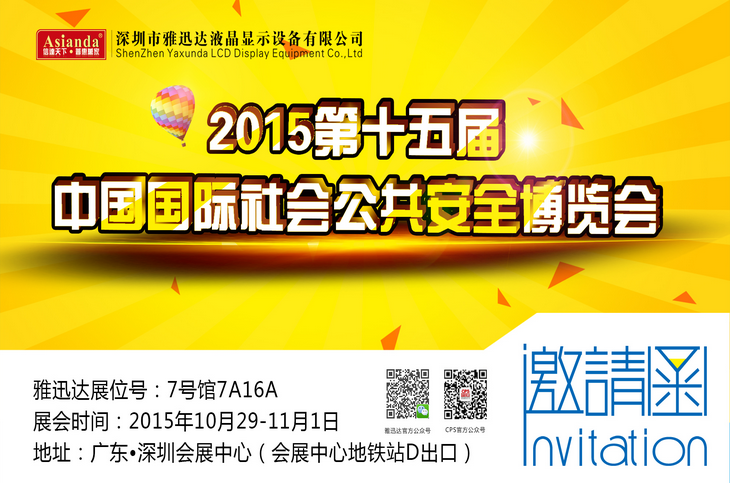 2015年10月29日,第十五届中国国际社会公共安全博览会(2015深圳安博会)将隆重开幕。此次展会作为两年一度的安防盛宴,雅迅达应邀参加,并将展示公司近期研发的产品及新技术,其中有行业创新产品:AHD监视器YXD-B228HD-A。雅迅达展位号:7号馆7A16A。