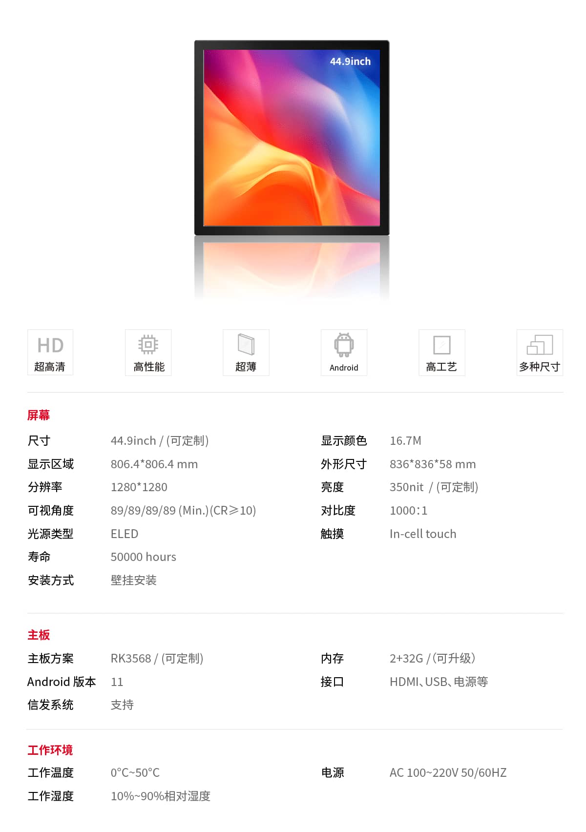 方形屏区别于传统16比9的液晶屏,为1比1正方形显示,能起到更好的宣传展示作用